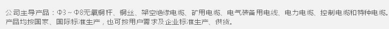 公司目前產(chǎn)品有:Φ3~Φ8無氧銅桿、銅絲、1-35kV裸電線、電氣裝備用電線、電力電纜、控制電纜和特種電纜。產(chǎn)品均按國(guó)家、國(guó)際標(biāo)準(zhǔn)生產(chǎn),也可按用戶需求及企業(yè)標(biāo)準(zhǔn)生產(chǎn)、供貨。